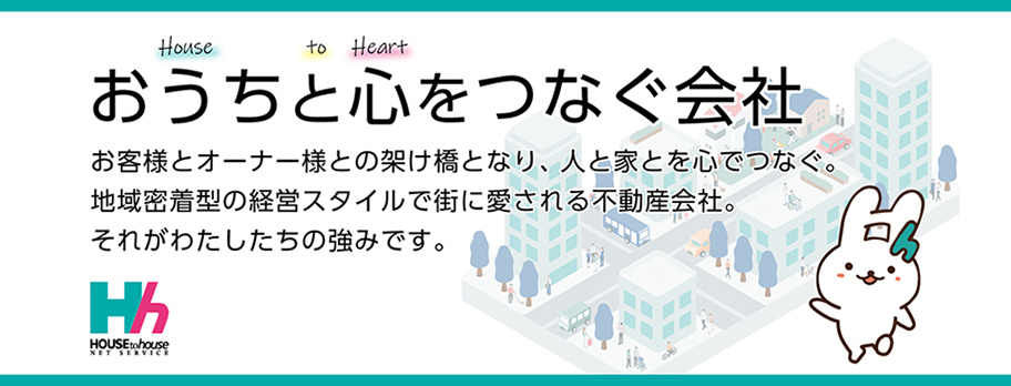 弊社のスローガンは「おうちと心をつなぐ会社」。私たちは、お客様とオーナー様の架け橋となり、人と住まいを心でつなぐ存在でありたいと考えています。地域密着型の街に愛される不動産会社として、安心と信頼をご提供してまいります。