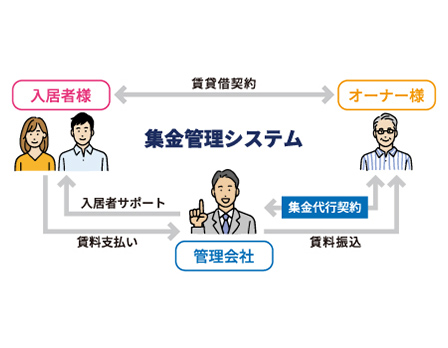 集金管理プランでは、オーナー様に代わり、募集から入居者管理までのすべてを代行いたします。トラブルへの対応、家賃滞納者への催促、各種契約手続き、退去時の立会い、敷金清算など、これらの業務を弊社が一括しておこないます。