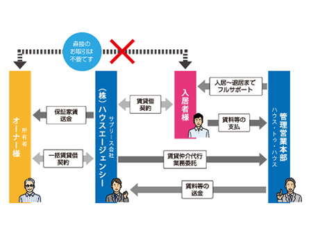 一括借上プランは、100%子会社である(株)ハウスエージェンシーが不動産をオーナー様から一括借上げし、入居者に賃貸するサービスです。入居状況に関係なく毎月定額の賃料が保証されるため、空室リスクを回避し安定した収入を得ることができます。